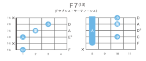 - ギターでC7(13)を押さえる場合は、コードの性格への影響が少ない完全5度の音(Cから数えてG)が省略されることが多い。