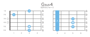 G7sus4コード (Gセブンス・サスフォー) の押さえ方をギターの指板図で13通り紹介しています。G7sus4の構成音、Gsus4とG7sus4との違いをわかりやすく解説していますので、ぜひコード学習の参考にしてください。