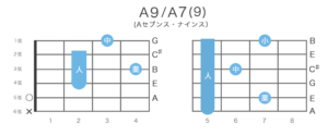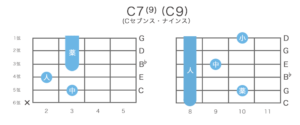コード名 | ルート音 | 長3度 | 完全5度 | 短7度 | 長9度 |