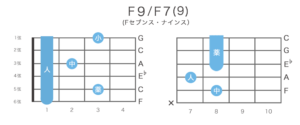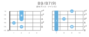 この押さえ方の最低音は5弦9フレットのF♯であるが、