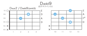 - Dadd9:三和音のDメジャーに長9度を足した四和音のテンションコード