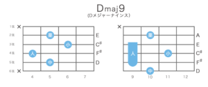 - Dmaj7(9):Dmaj7に長9度を加えたコード