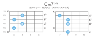 - Cm7(♭5)は減三和音(ルート + 短3度 + 減5度)に短7度(Cから数えてA♭の音)を加えたコード