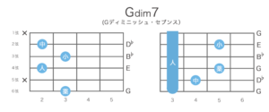 4弦4フレットのG♭をルート音とするとG♭dim7になるが、