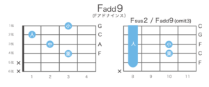 Fmaj9 / Fmaj7(9)のギターコードの押さえ方・指板図・構成音