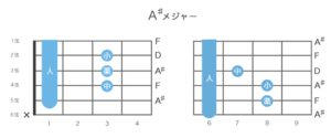 6弦ルート①の押さえ方を省略した形、ルート音は4弦6フレット