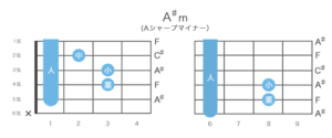 - A♯とB♭は異名同音(音名は異なるが実際の音が同じ音)で、A♯mとB♭mはコードの押え方や実音は同じであるが、構成音の音名が異なる。