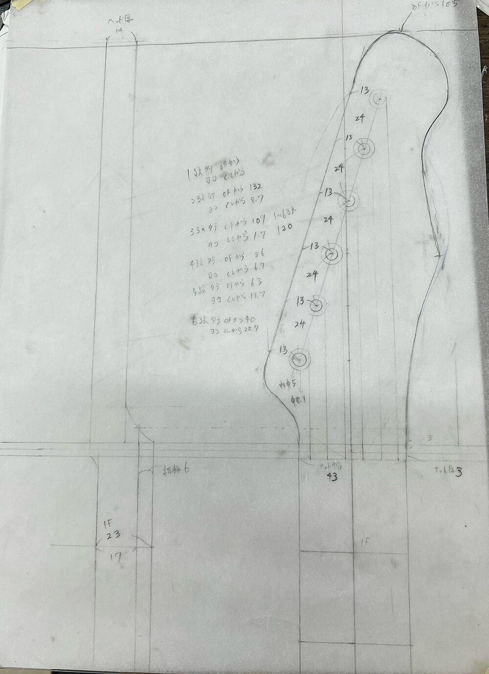 ペグ同士の距離、外周からのペグの距離、0フレットから各ペグまでの距離を記載しておきます。