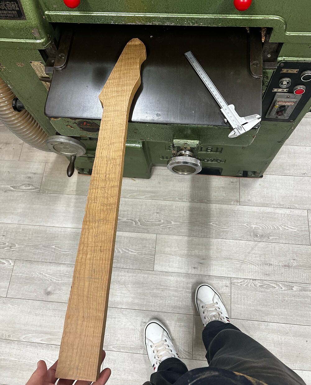 ・プレーナーで指板トップ面(表面)を削って厚みを落とす