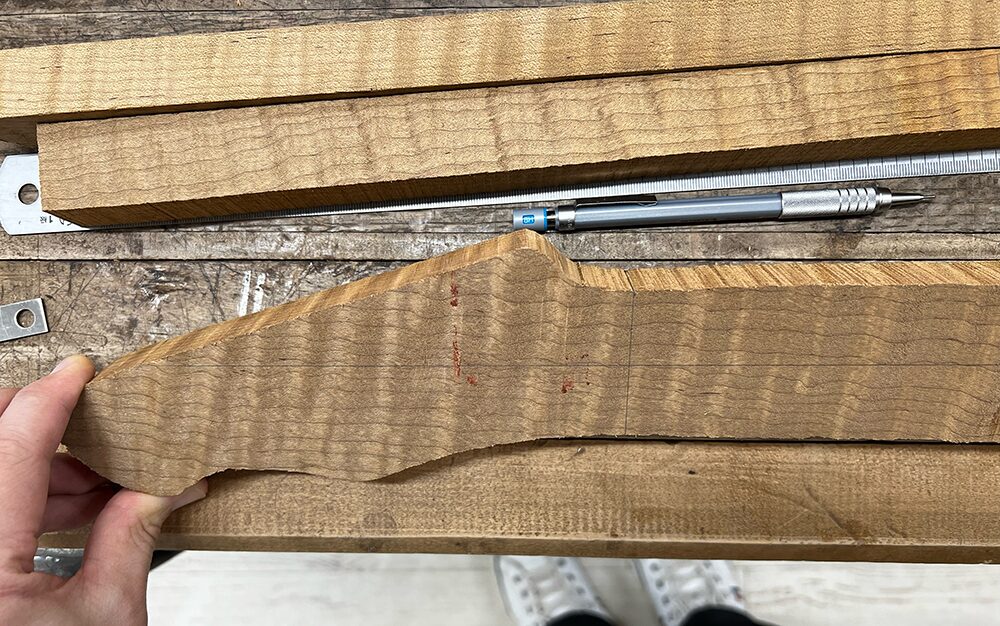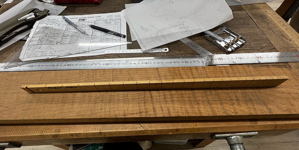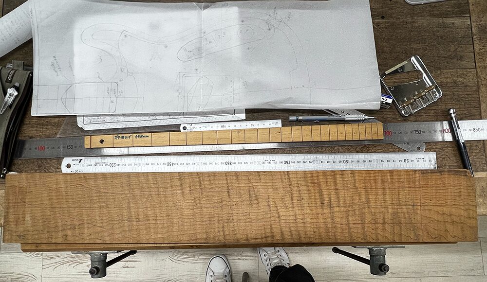 ヘッドの形状、ネック幅、フレットの位置などをネック材に罫書き。