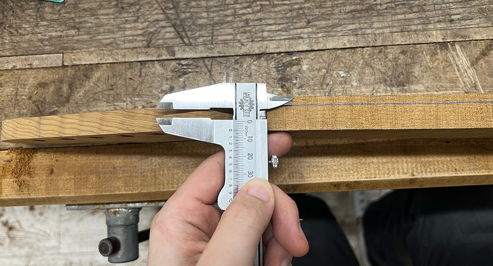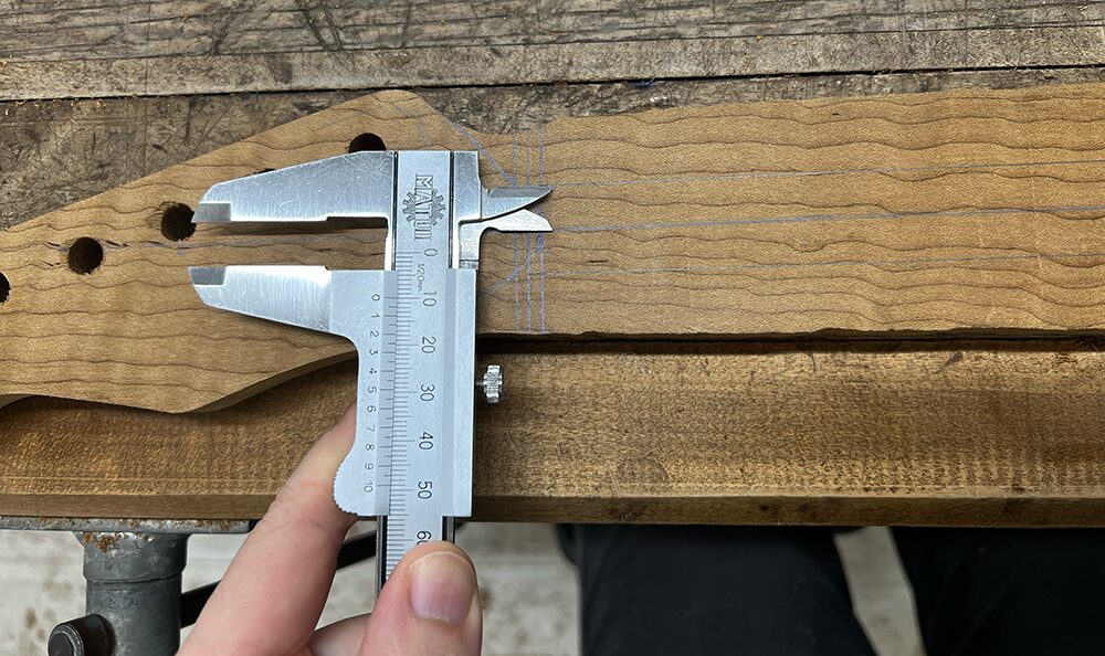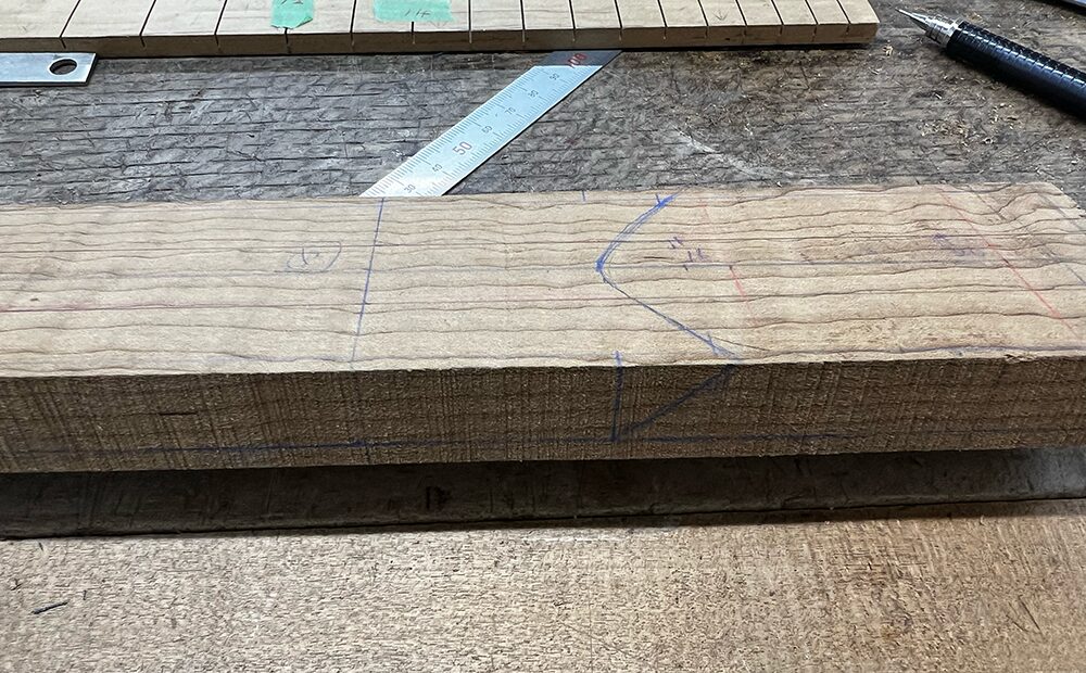 粗加工ではネックのサイドを残しておく必要があるので、ネックのトップ面から5mmの位置に罫書きの線を引き、そのラインを超えないように削ります。