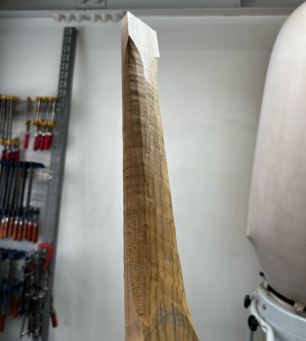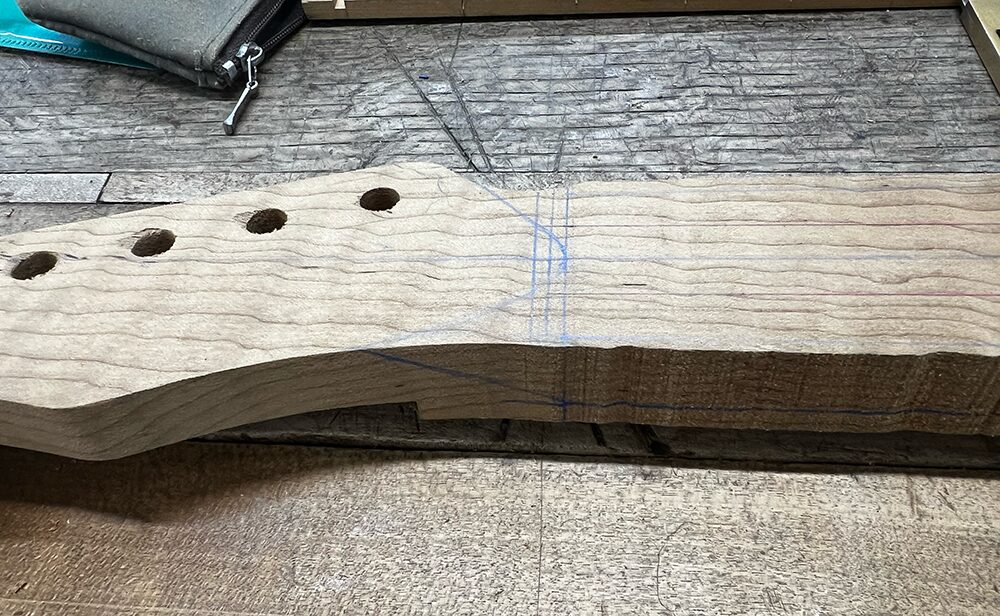 今回はヘッドにペグ穴をあけて、ヘッドの厚み落としをやります。