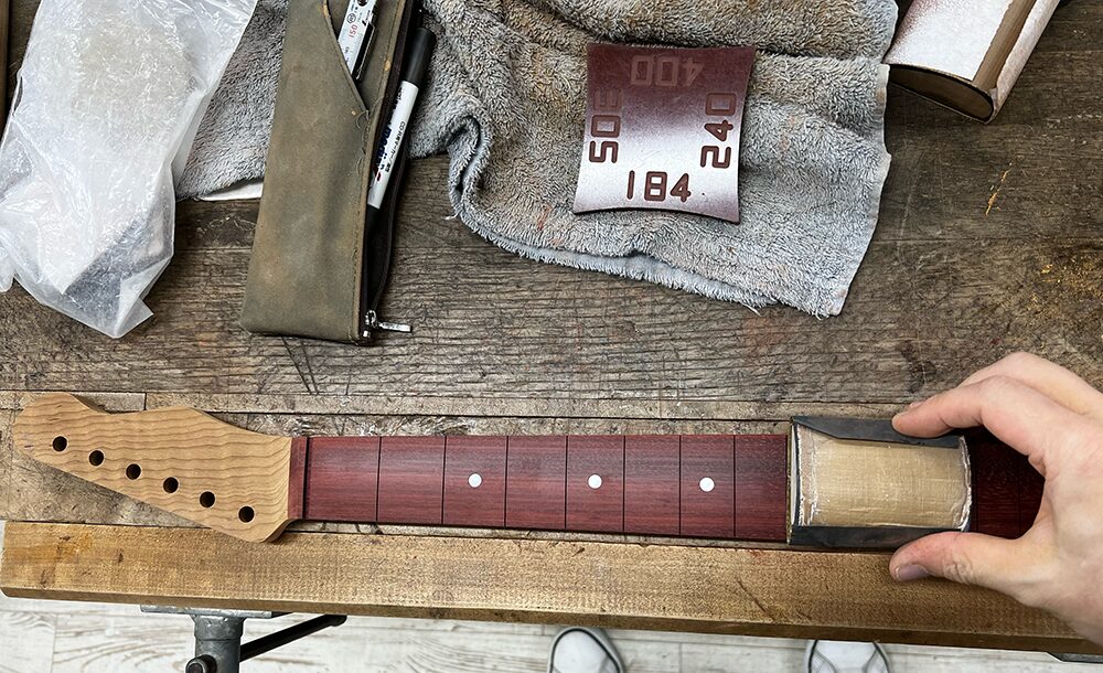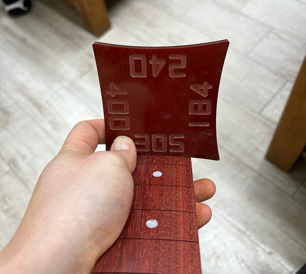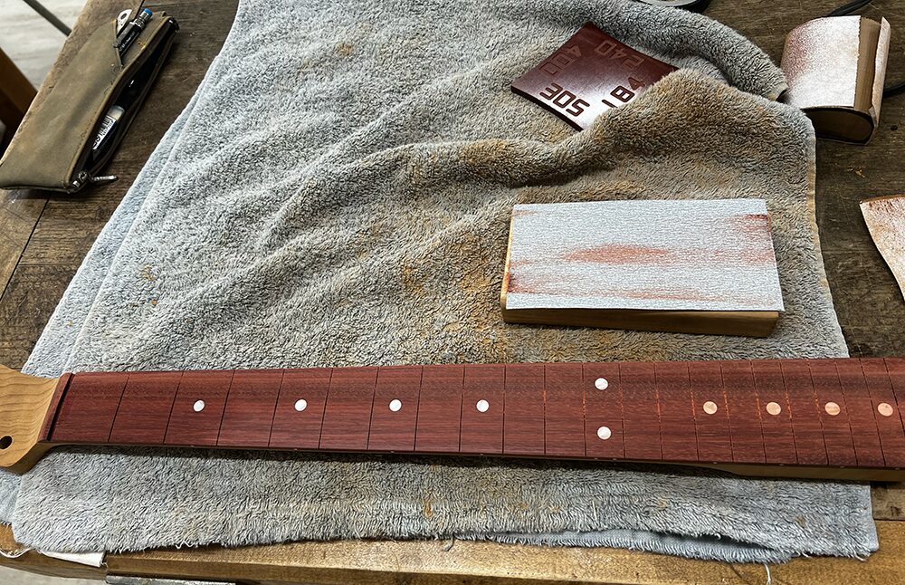 フレットを打つ前に、#320と#600のサンドペーパーで指板を磨きます。