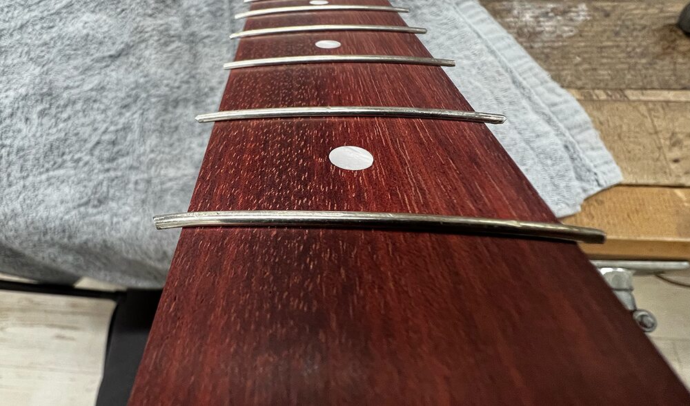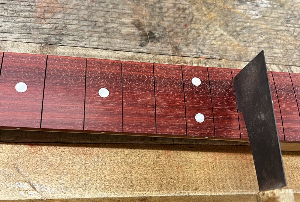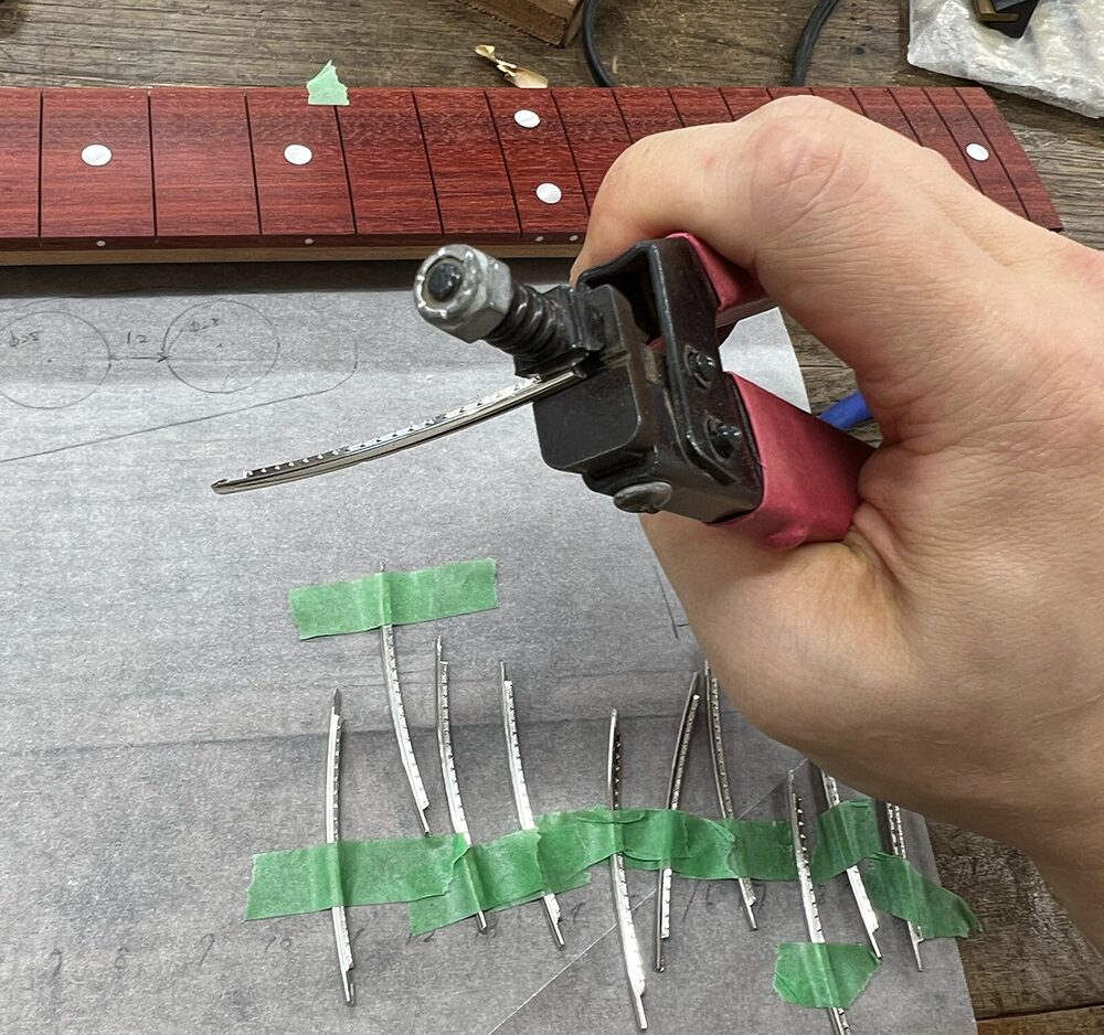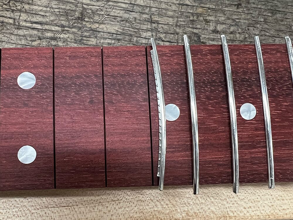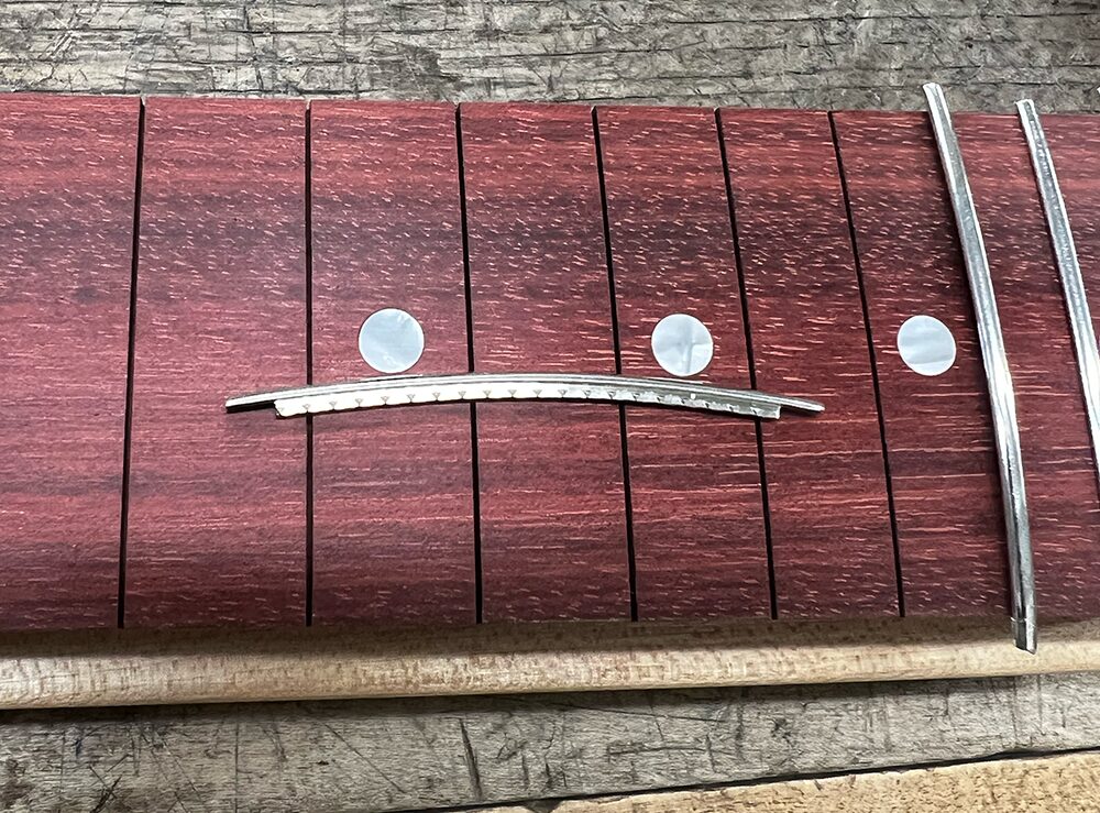 フレット打ちは曲げ具合が大事で、曲げが上手いとスッとフレットが埋まります。