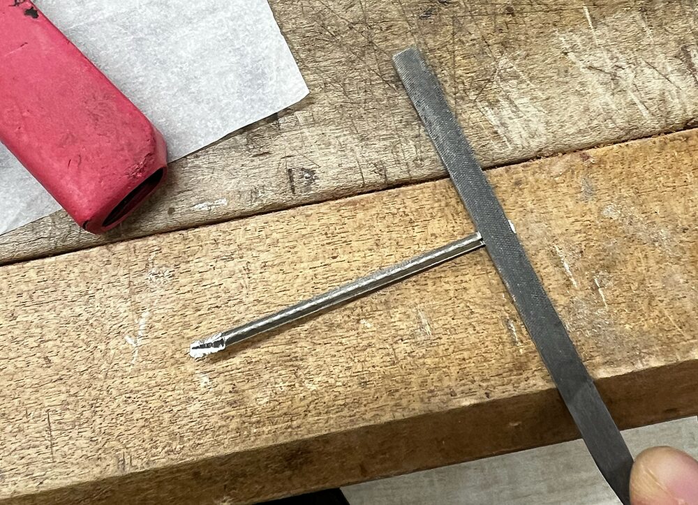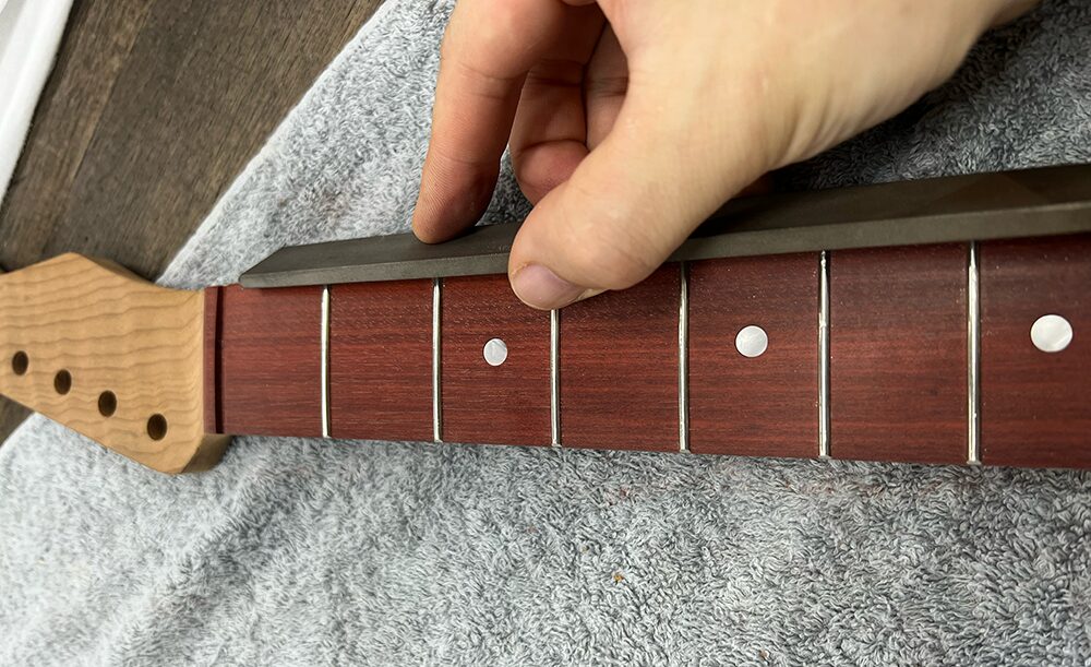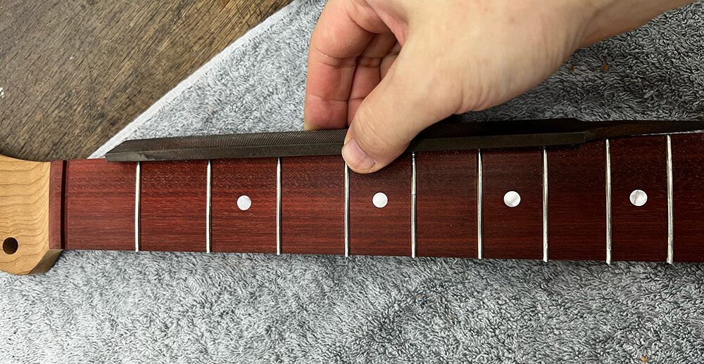 バリがある状態でフレットを指板に打つと指板にバリが食い込んで傷ついてしまうので、精密ヤスリでバリを落としておきます。