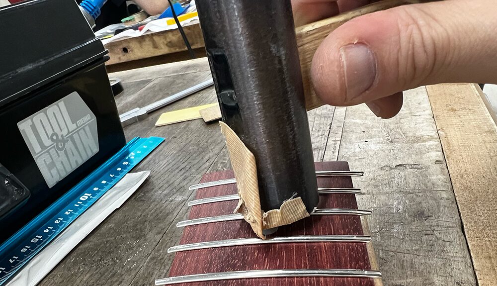フレットを手打ちする場合は、まずは両端をしっかり打って埋め込み、徐々に中心に向かって打って埋めていきます。