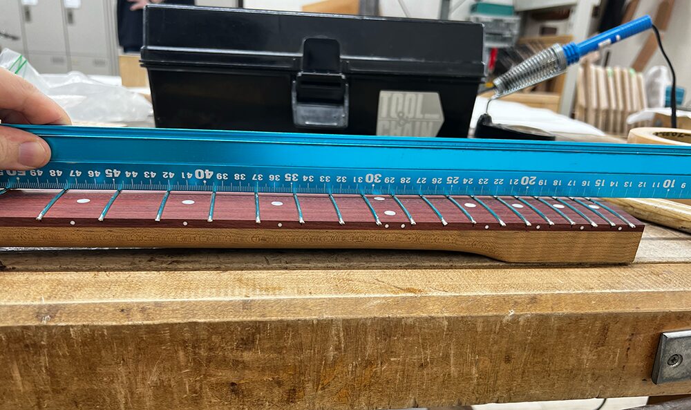 600mmスケールをあててガタつくところがあれば、フレットが埋まりきっておらず、他のフレットよりも飛び出ている可能性があるので、再度玄能で叩いてしっかり埋め込みます。