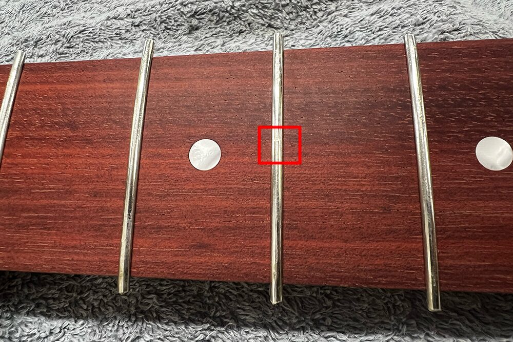 手前のフレットは端が傾いて少し浮いているように見えますね。