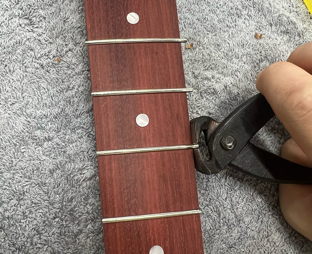 フレットが溝から浮かないように、下方向に力を入れながら切断します。