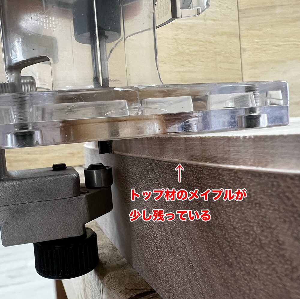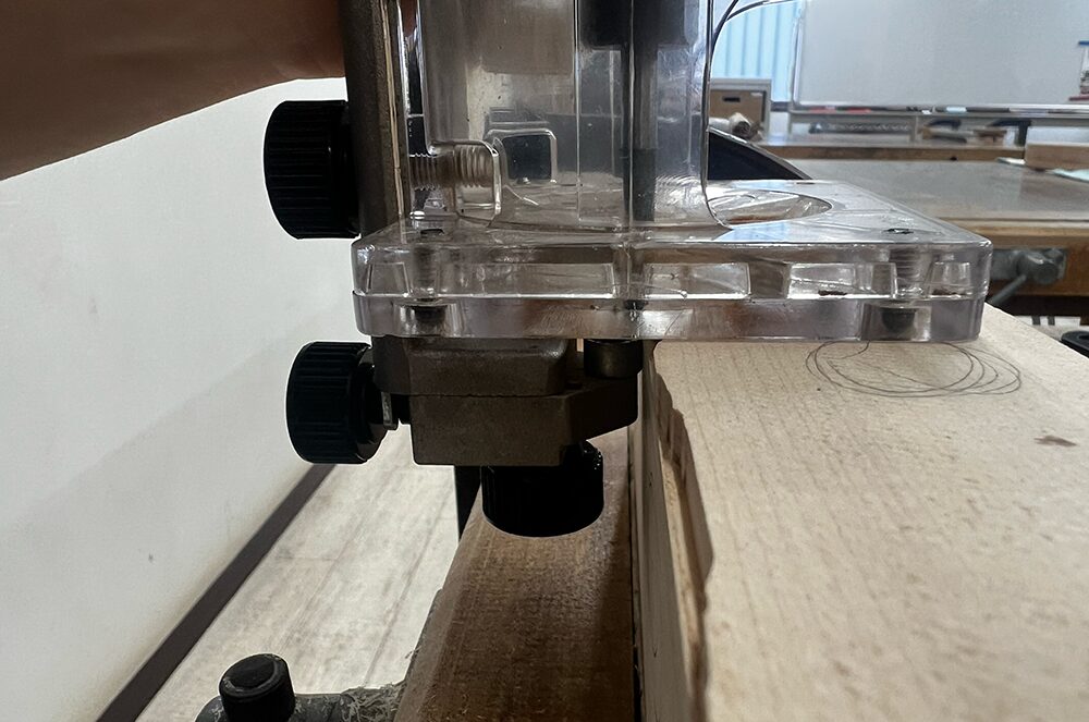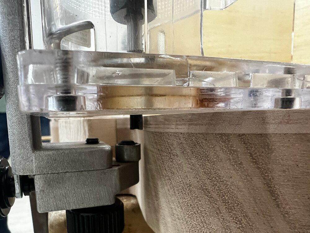 ボディバインディングはトリマーにガイド付きのアタッチメントを取り付けて掘っていきます。いきなりボディに加工を施さず、まずは端材で試し堀りをします。