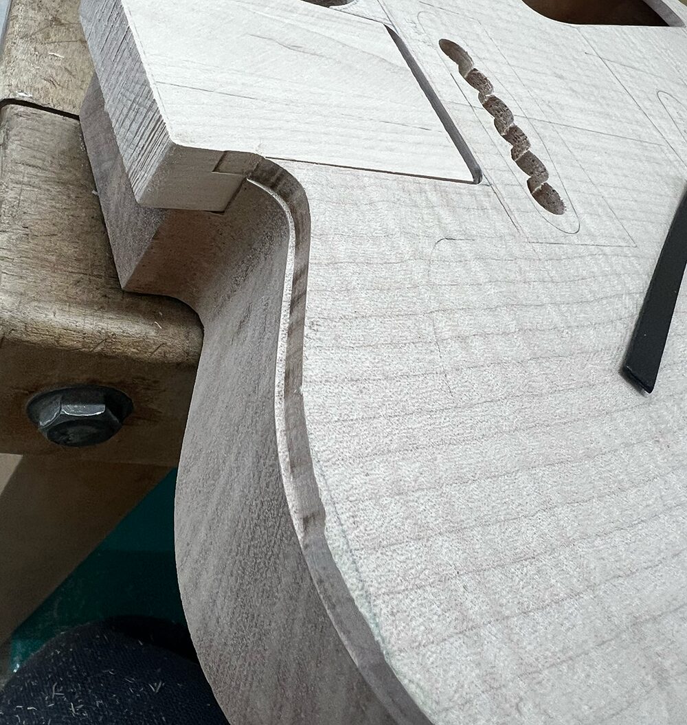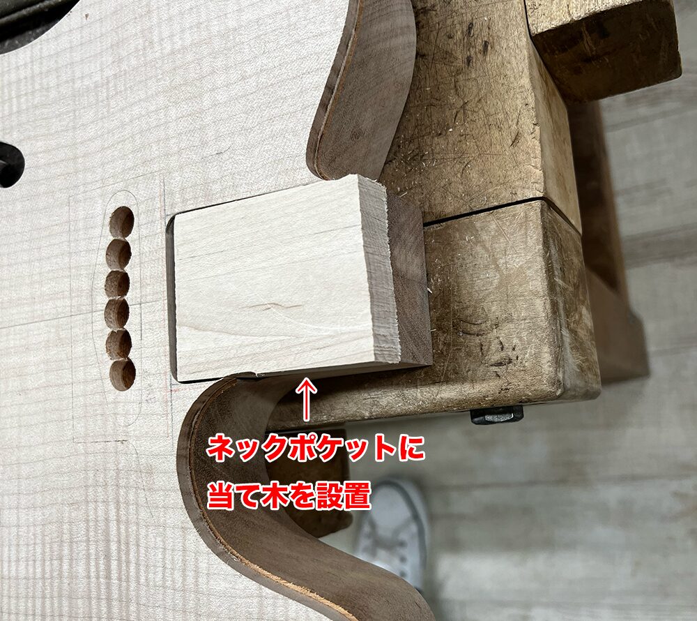 カッタウェイ周りはネックポケットザグリがあってトリマーが落ちてしまうので、ポケット内に当て木を設置して掘りました。