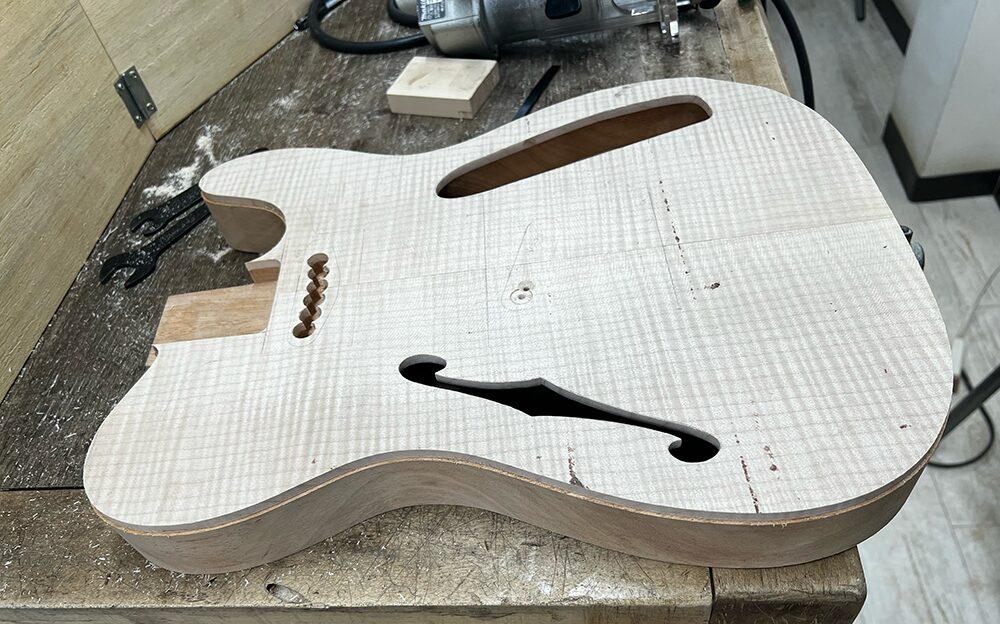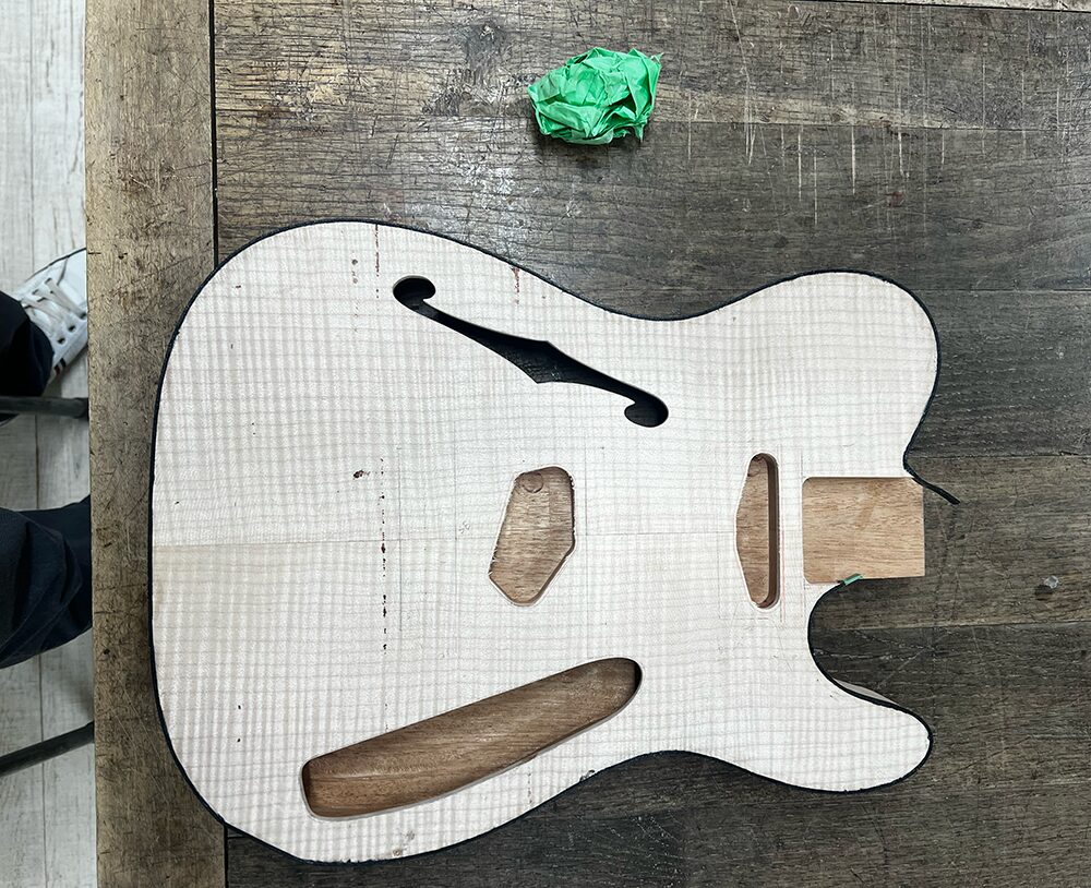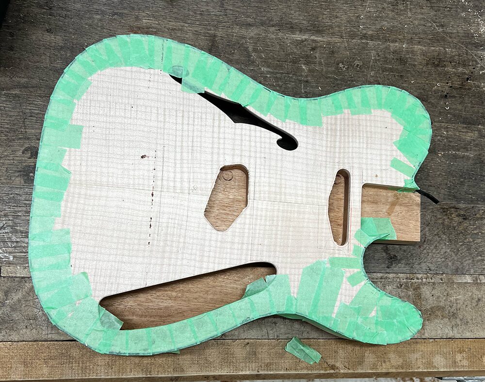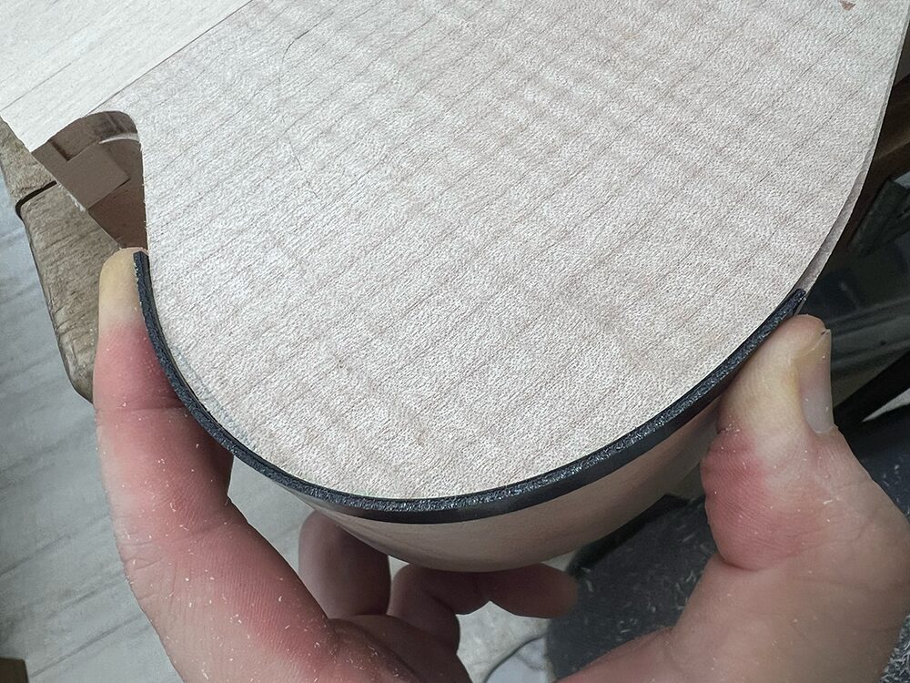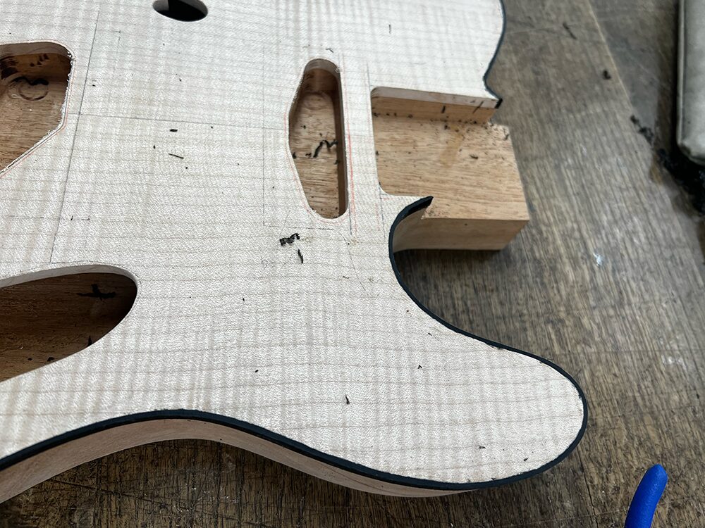 外周加工が終わった状態です。ボディバインディングを貼るには、ボディの外周の形をしっかり作っておく必要があります。