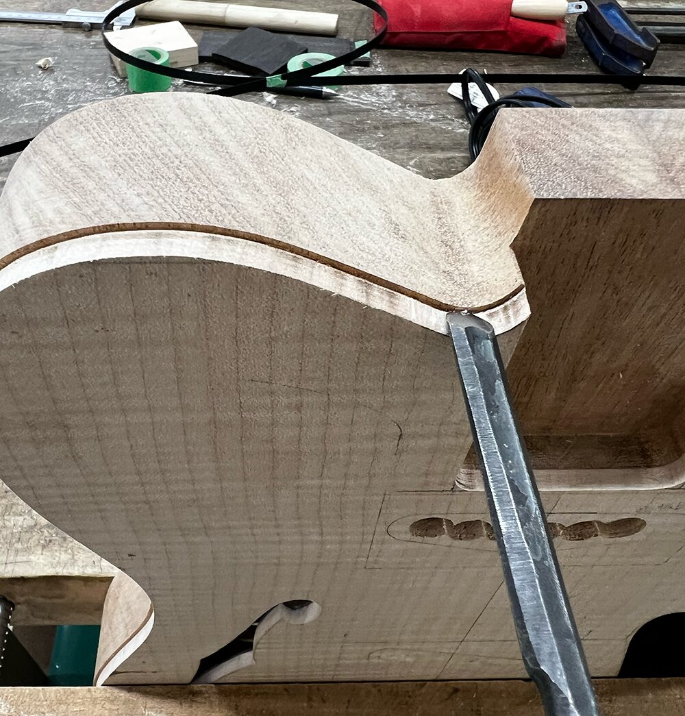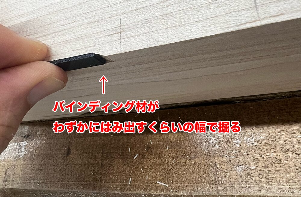 試し掘りで設定した幅のまま、ボディにバインディング溝を掘ります。