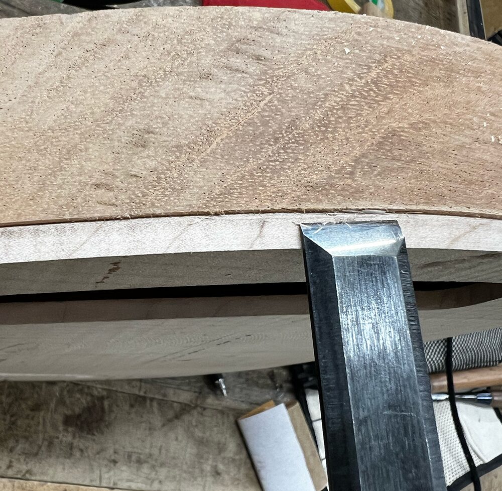溝の深さについて。今回は5mmのトップ材を貼っているので、トップ材が残らない位置まで掘ります。少し掘り進めて確認すると、まだトップ材のメイプルが残っているのが見えます。この状態でバインディング材を貼ると、メイプルが中途半端に見えてしまうので、バック材のマホガニーが見える位置まで深さを落とします。