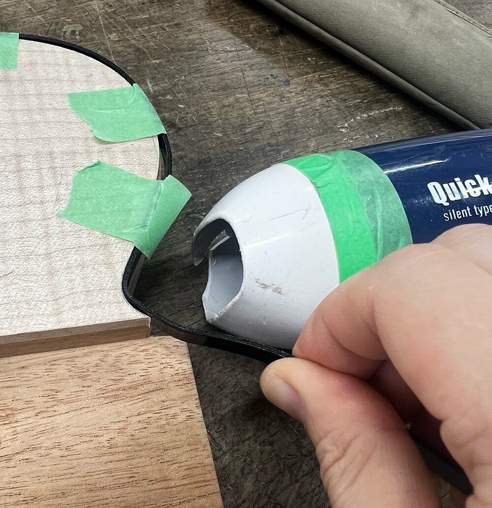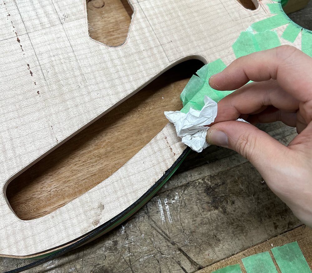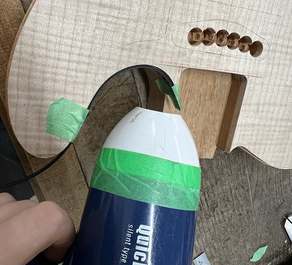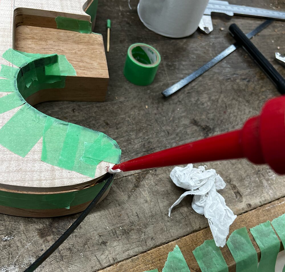 ドライヤーでの曲げができたらマスキングテープで仮留めをします。ネックポケット周りは少しバインディング材がはみ出す長さにしておき、接着後に切ります。