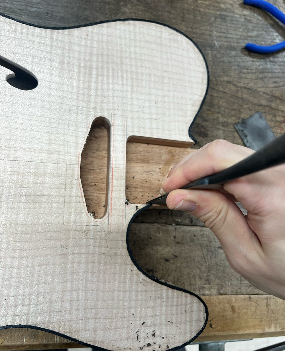 ネックポケットからはみ出ているバインディングを仕上げノミで切り落とします。