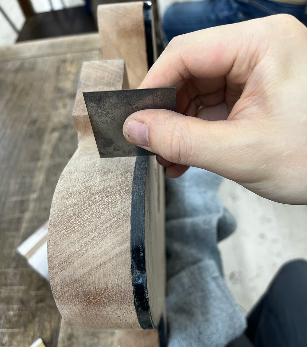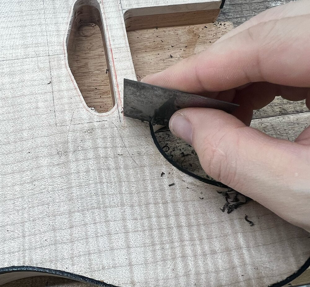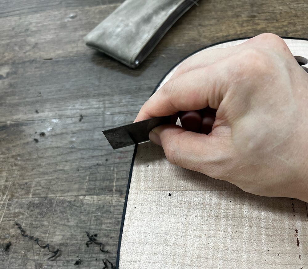 バインディングがはがれないように、スクレイパーをボディの内側に向けて削るのがポイント。