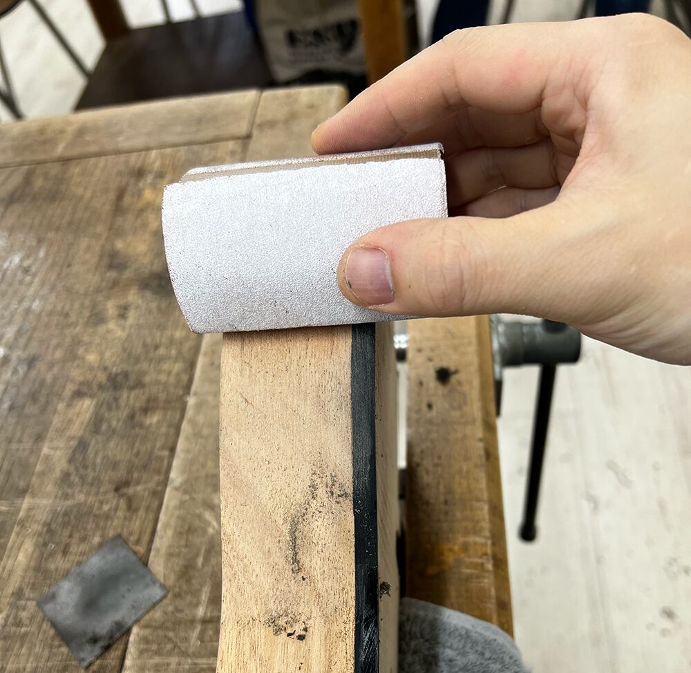 ある程度スクレイパーで削ったら#150のサンドペーパーで整えます。