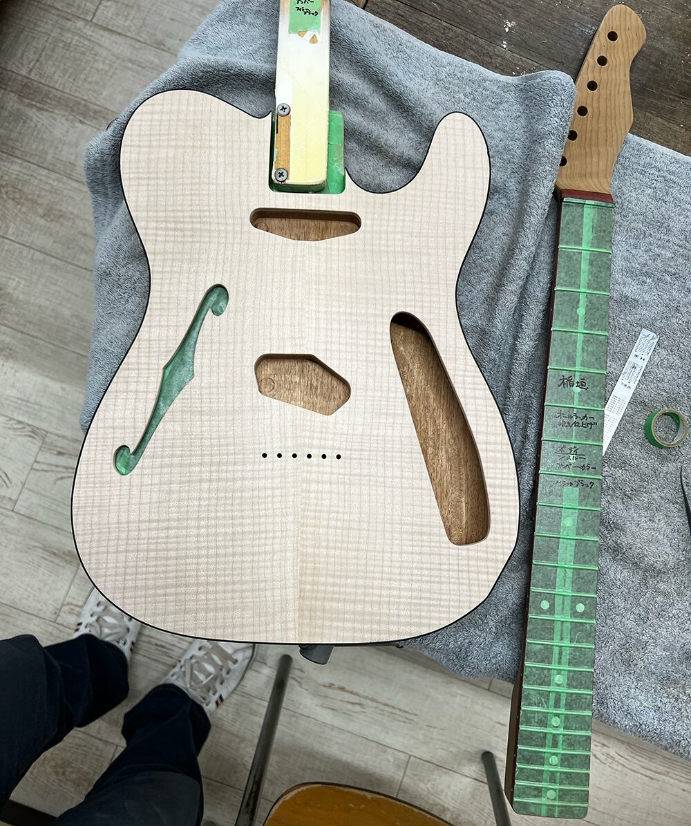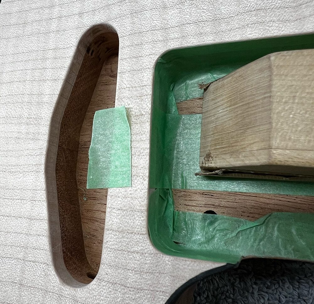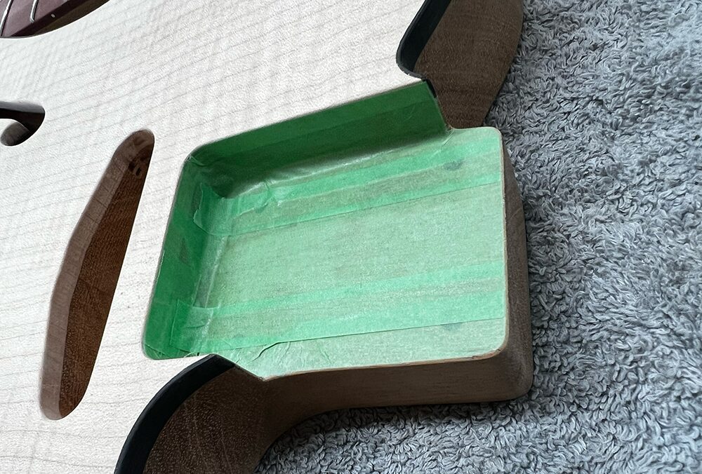 デタッチャブルのボディのネックポケットは塗装を乗せないので、マスキングテープを貼って保護します。