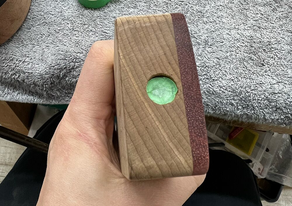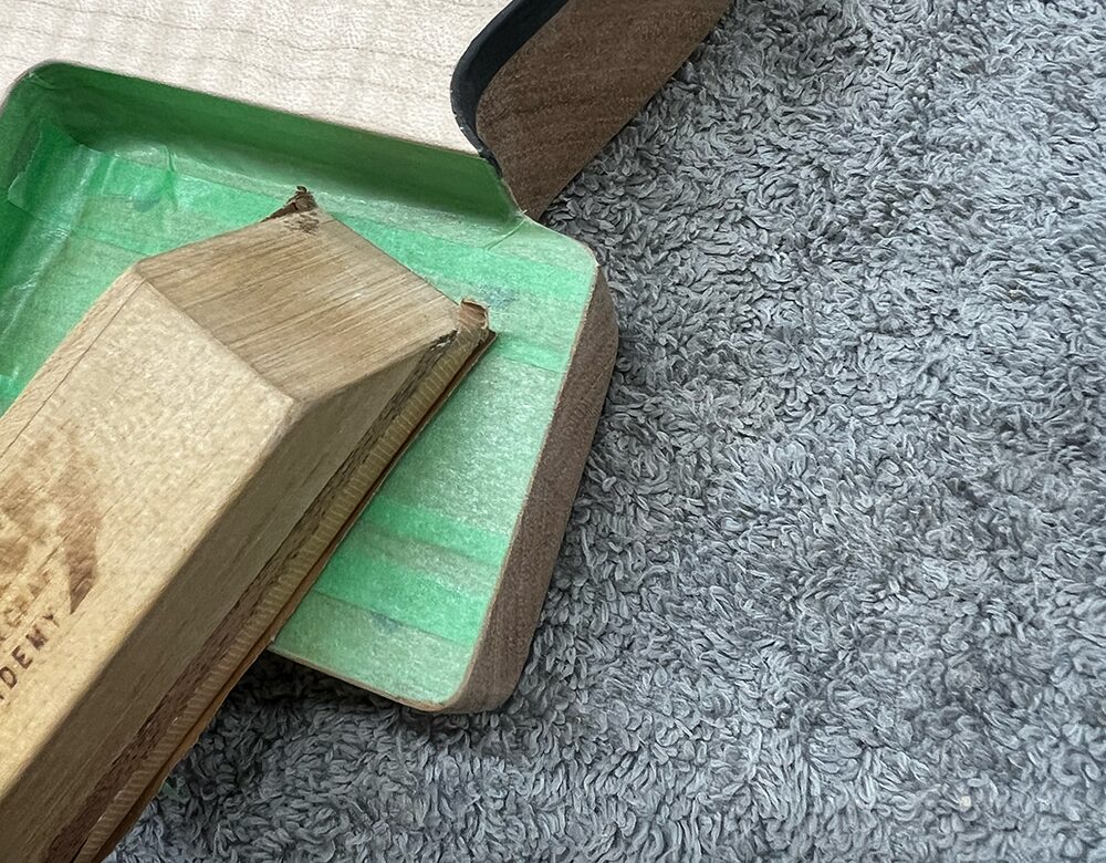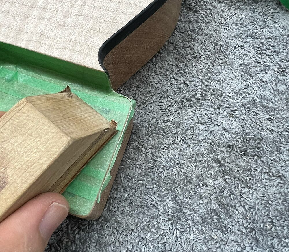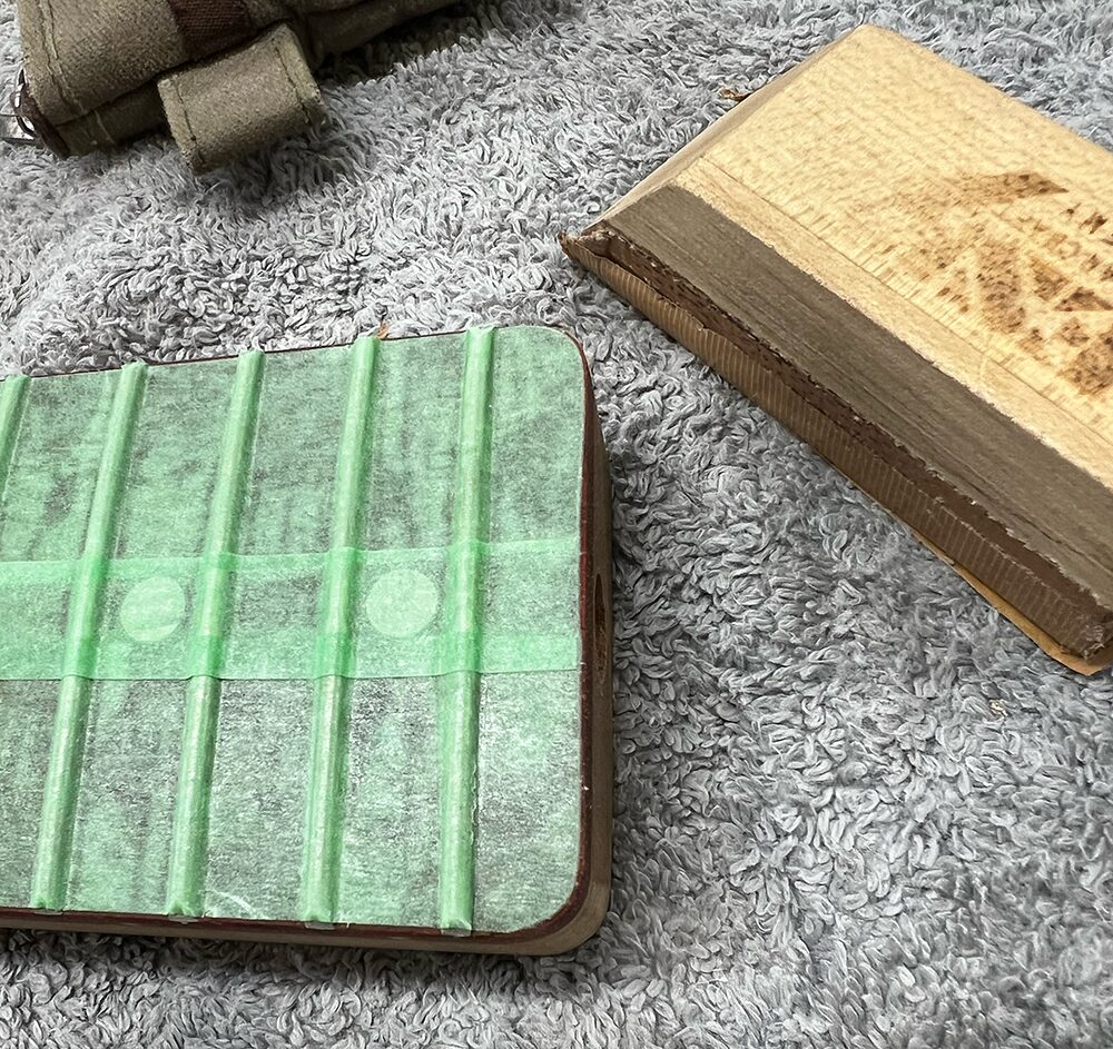 #240のサンドペーパーを貼ったパッドで角をこすり、マスキングテープを削り落とします。