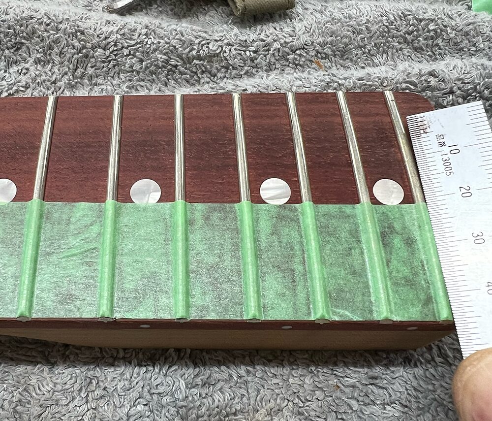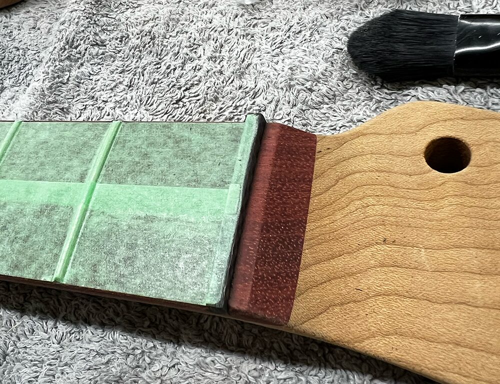 指板も少しだけ塗装を乗せるので、エッジから0.数ミリ余白を取ってマスキングをしていきます。