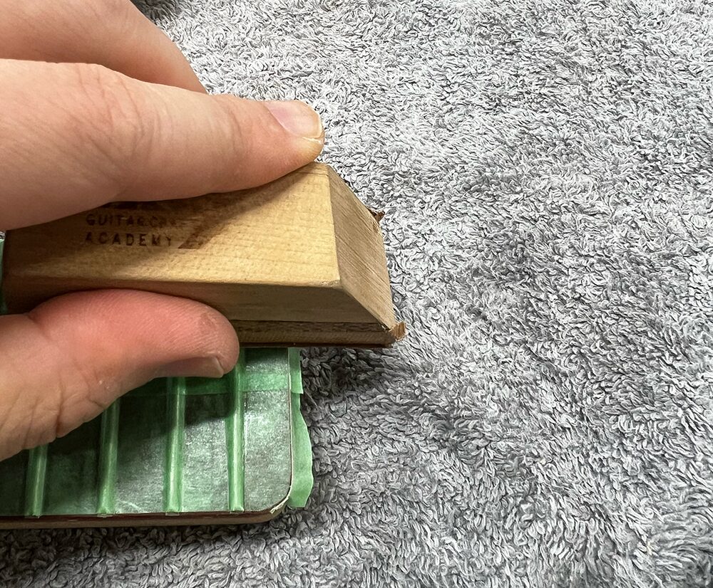 指板エンドも#240のサンドペーパーでこすってマスキングテープを削り落とします。