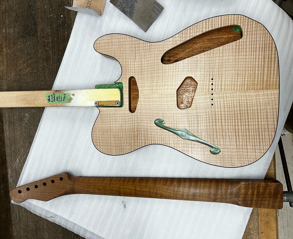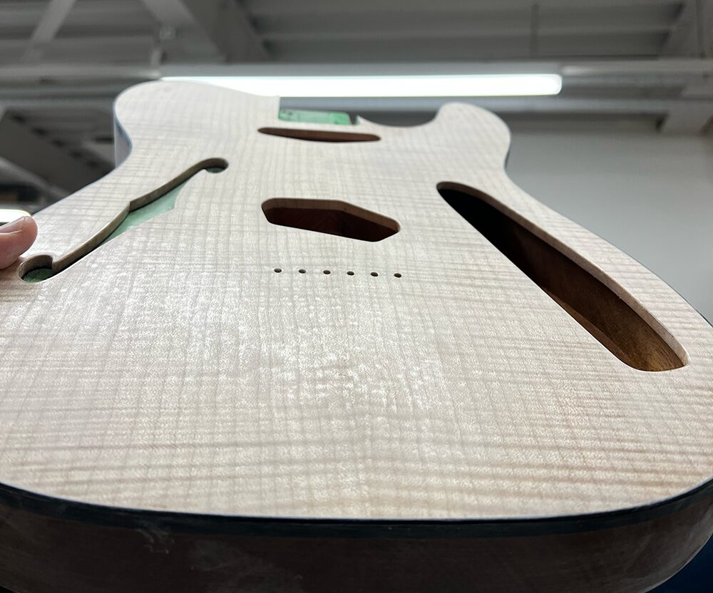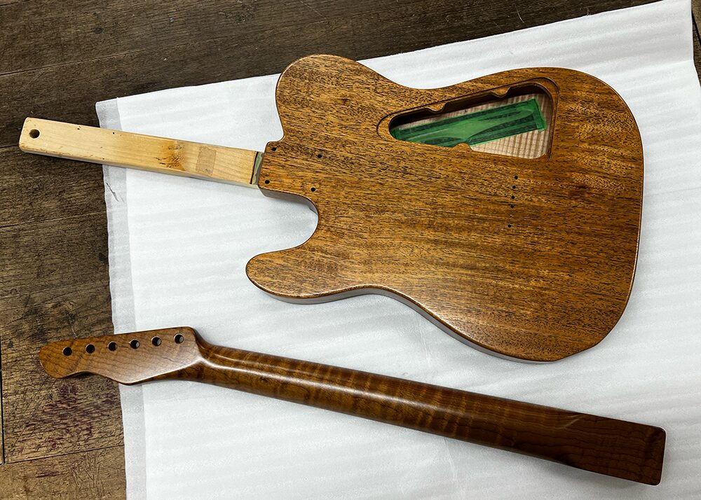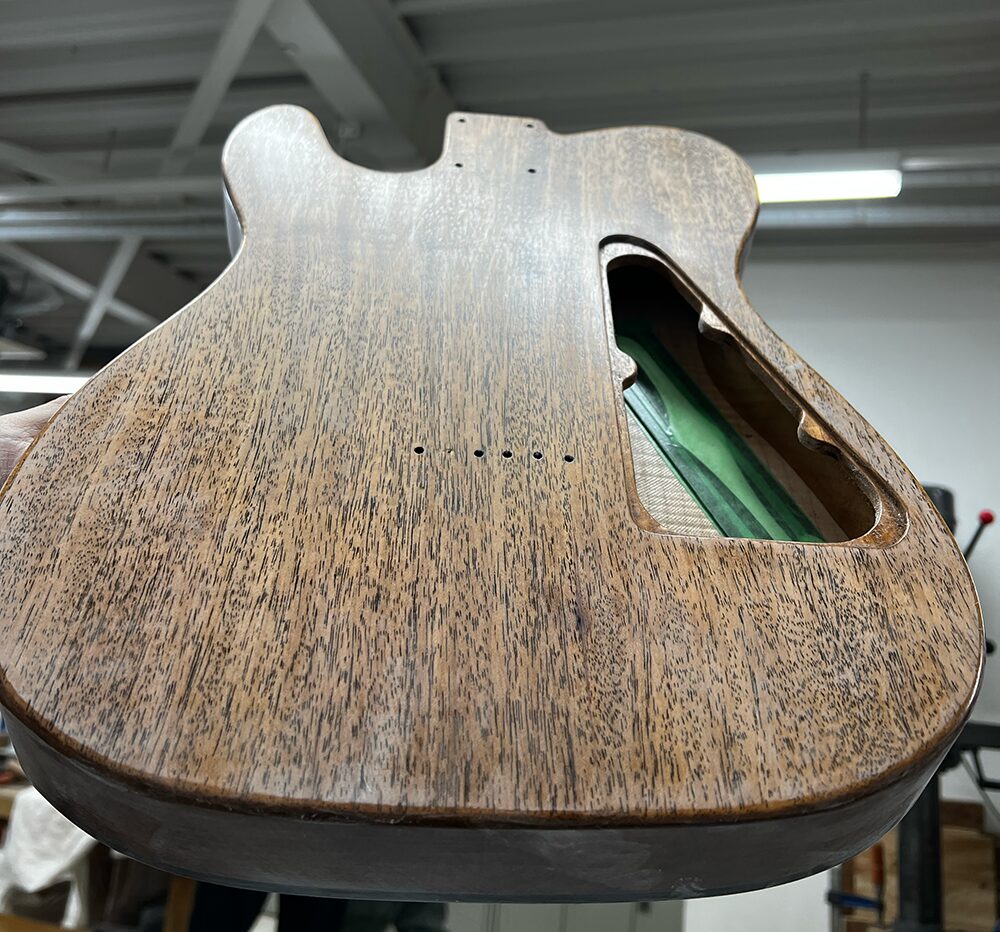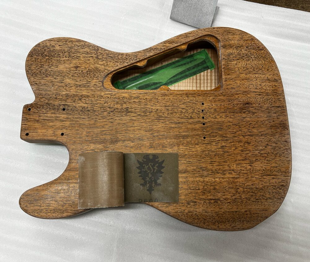 【7作目】ラッカーサンディングシーラー:ギタークラフト学校日誌(331)前回はボディバックに使っているマホガニーの導管を埋めるため、ウッドフィラーを塗り込みました。