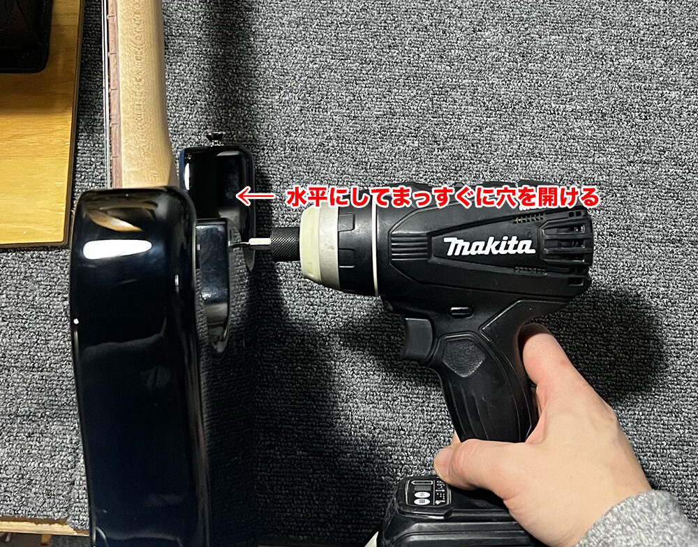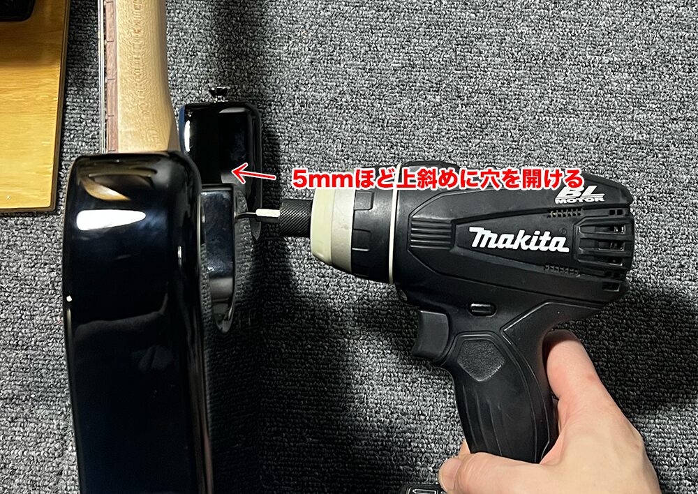 ネックセットの穴は、最初はほんの少し上斜めに角度をつけて開け始め、5mmくらい進んだら水平にしてそのまま真っすぐ穴を開けます。ネックプレートの穴は皿切りをされていて、ビスはその形にぴったり収まるため、ネック側の穴をネックプレートの穴よりも少し上側にあけておくことで、ネックビスを留めたときにボディ側に力が加わり、ネックポケットエンドが密着しやすくなります。