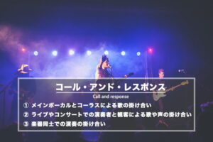 • コールアンドレスポンスは、歌手と観客が掛け合いで歌う形式で、基本的には歌手と観客が交互に歌ったり言葉を返したりするもの。
